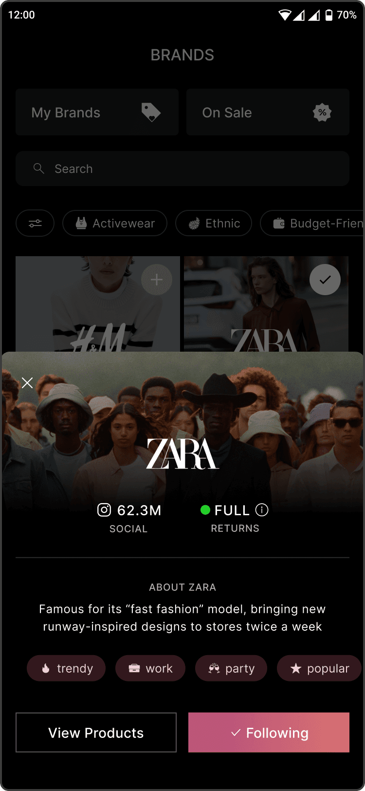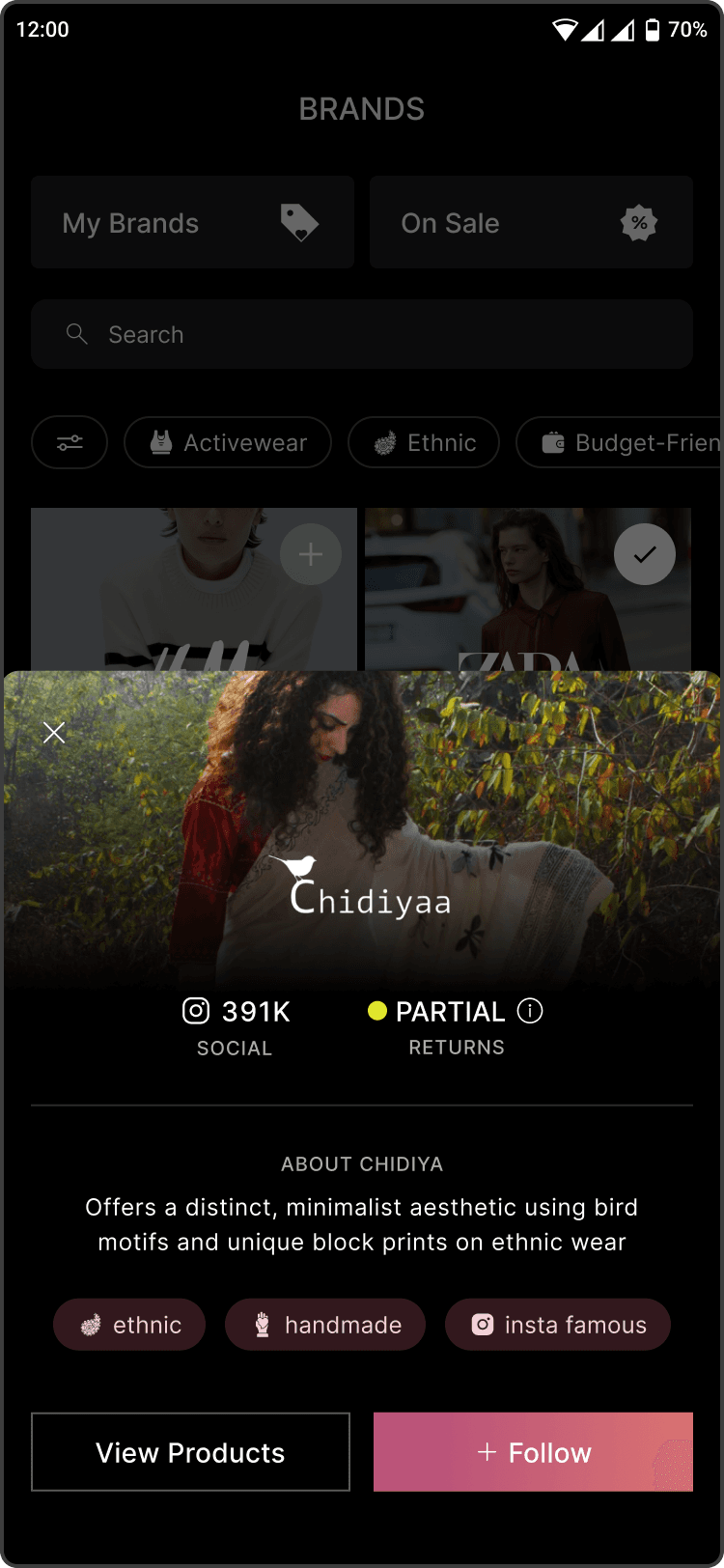 The brand bottom sheet provides quick context before users explore further. It displays the brand’s return policy, a short description, and relevant tags to help users understand what the brand stands for and whether it aligns with their preferences.
