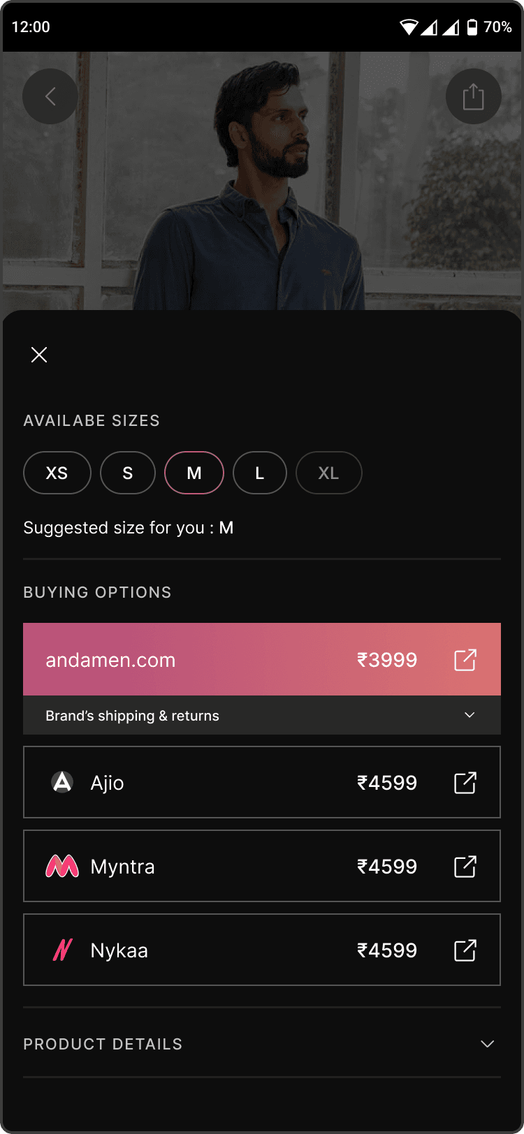 The Product Detail Page(PDP) focuses on helping users decide, rather than pushing them to buy. Size suggestions, price comparison, and price history are shown together so users can feel more confident about fit and value before moving forward.